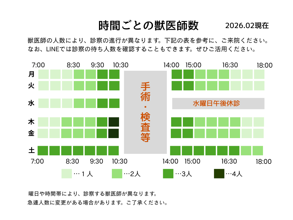 獣医師の人数により、診察の進行が異なります。下記の表を参考にご来院ください。